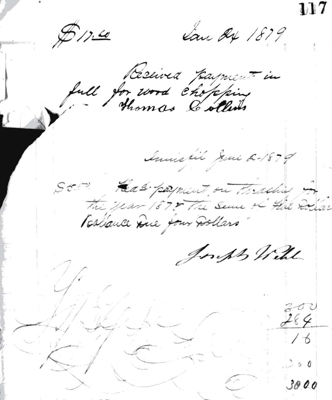 Receipt dated January 24, 1879: "Received pay in full for wood chopping Thomas Collins - $17.60; Receipt Innisfil June 2, 1879. Received payment for thrashing for the year 1978, the sum of five dollars. Balance due, four dollars. Joseph Webb BUSINESS - RECEIPTS