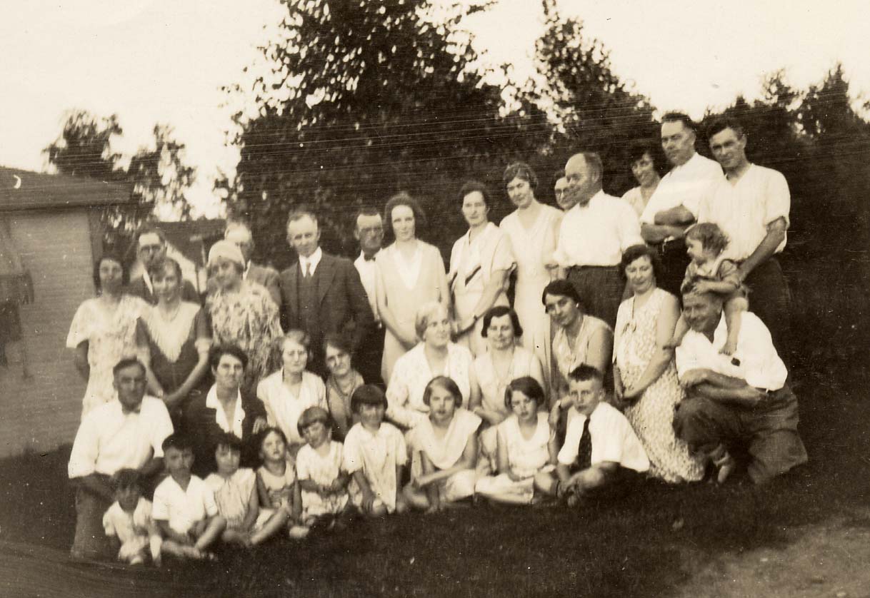 Back row L.to R. Ida McFadden, Mel McFadden, Cliff Kell, 4. , 5. , 6. , 7.Gazy Kidd, 8. Edith McKenzie (friend of Gazy), 9. , 10. , 11. , 12. , 13. Dave McMaster Front Row - 1. , 2. , 3. Gladys Chantler, 4. Mabel Chantler, 5. Bea McFadden, 6. Olive Broley, 7. , 8. Olive McMaster (Burling) 9. Ewart Kidd and Pat Kidd Front Row - 1. , 2. , 3. , 4. , 5. McMaster, 6. Joan Kidd, 7. Lillian McMaster, 8. Yvonne McMaster, 9. .