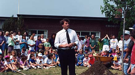 Photo of Mr. Lindros, the Vice Principal of Cookstown Public School, overseeing the planting of the 125th Canada Anniversary tree on 19 June 1992. The photo shows Mr. Lindros standing next to the tree and inside a circle of young students on a sunny day.