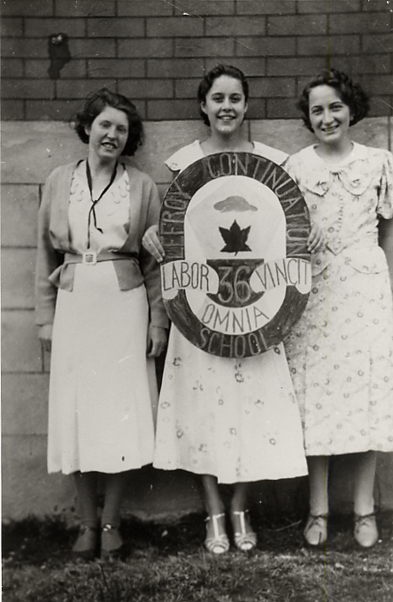 Left to Right: Betty (Montgomery) Sheldon, Marguerite Jack, Gladys (Kell) Gibson With School ensignia: "Work Conquers All"