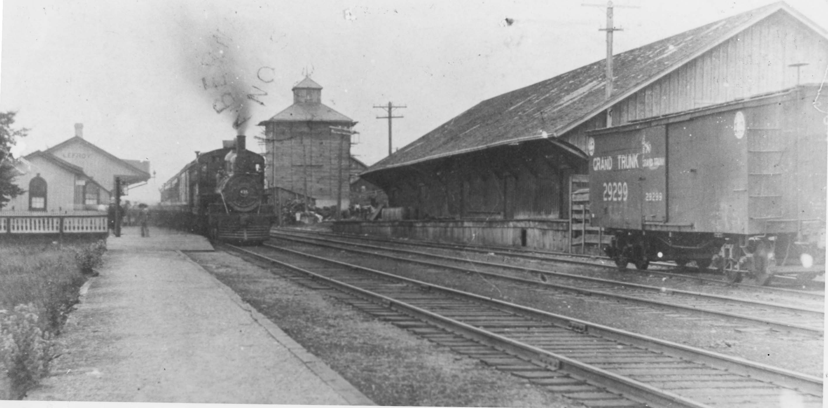 Lefroy Railway Station (Grand Trunk) C.N.R. Track Railways - Engines - Elevator (grain) - Freight shed 1906 Grand Trunk Railroad