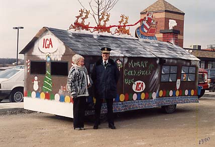 1990 Santa Claus Parade, Cooktown. In this colour photograph there are two people standing in front of a float. The float is decorated as a house with Santa Claus on the roof, in his sleigh with reindeer. The person on the left of the image is a woman wearing what appears to be a grey and black cardigan. The person on the right of the image appears to be a male police officer in uniform.