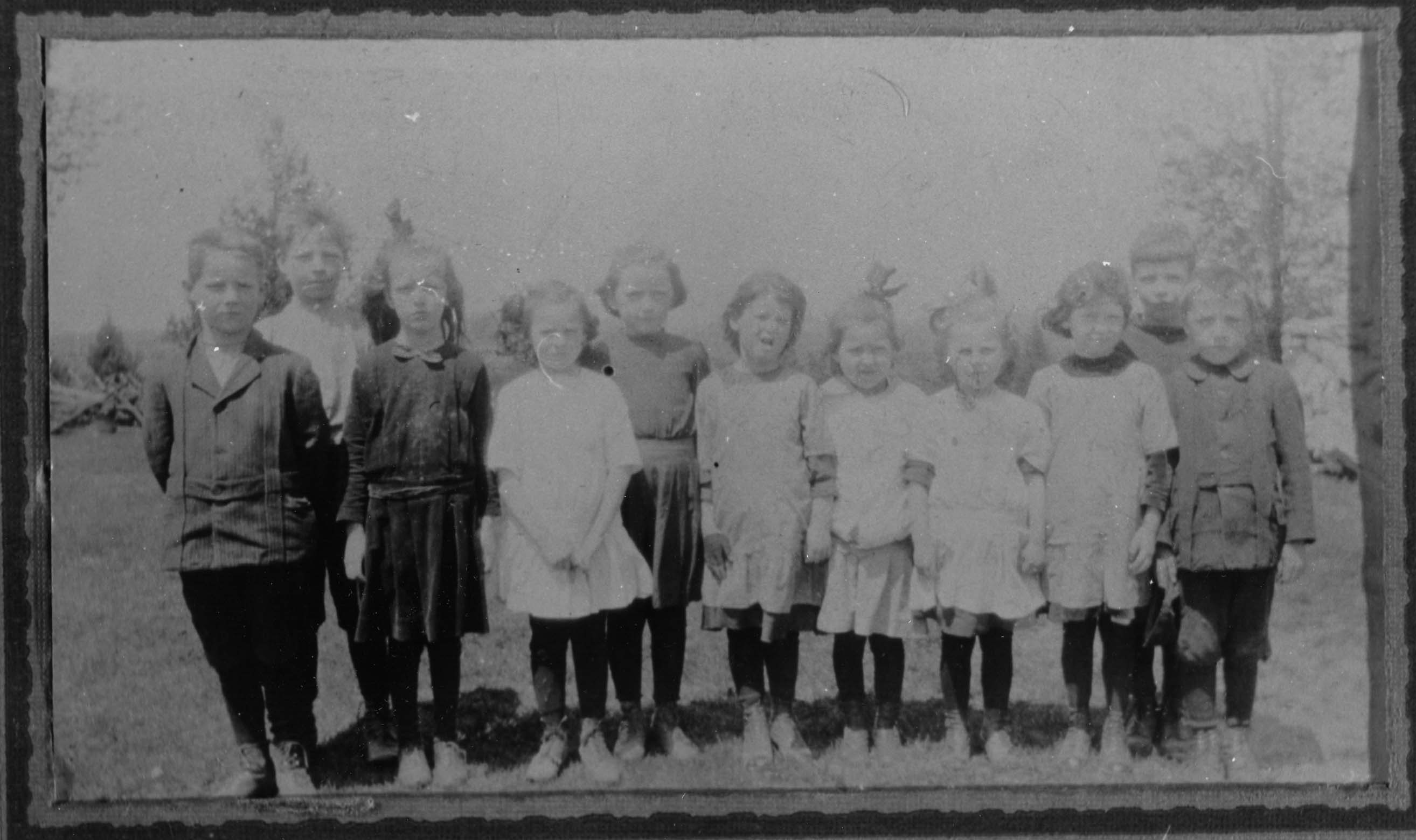 Bethesda School SS #2, 4th line #5 sideroad, teacher Mabel Irving. As they come zig-zag left to right: Alvin Smith, Alfred Baxter, Bessie Cunningham, Grace Nelson, May Allen (Thompson), Lucille Ayerst, Lorraine Davidson, Eileen King, Mildred Ayerst, David Cousins, George Morton.