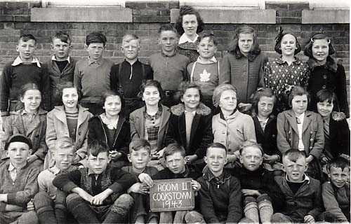 Class photo taken in 1943 of the members of Birnie Speers' class in room II of Cookstown Public School. Pictured from left to right, back row: five unknown, Jack Patton, Muriel Goodfellow, unknown, and Olive Copeland. Middle row: unknown, Pat Evans, Betty Gilroy, Bessie Hunter, Barbara Mieler, unknown, and Jean Carter. Front row: John Houghton, unknown, Bob Allison, and six unknown. The students are posed in front of the school's brick wall. Photo courtesy of Mrs. Eva Carter, February 1990.