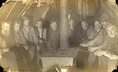 Evening spent arount stove at camp site. Members left to right: (1)Wm Nevills (2)W.K. McLean (3) (4)Alf Mooney (5)Russell Allison (6)Harry Fisher (7)Dewy Hopper (8)Henry Couse (9)Jim Wreggitt (10)Billy Draper