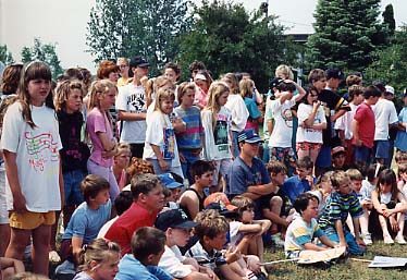 Photo taken in 1992 of Cookstown Central students gathered to watch the planting of commemorative tree for Canada's 125th Anniversary. The photo shows a number of children in shorts and t-shirts seated or standing on the lawn watching the event.