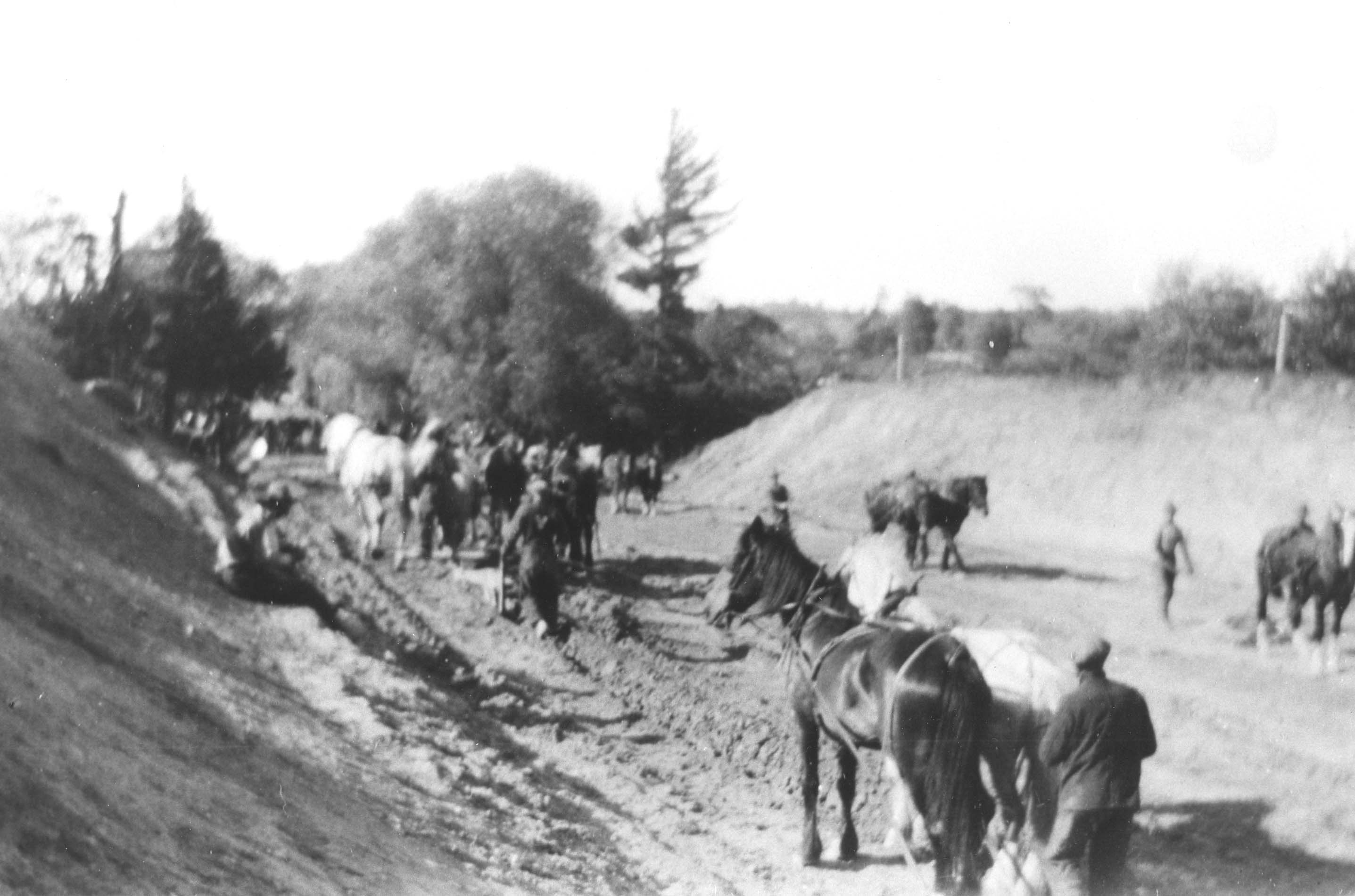 Photo showing teams of horses and men cutting down the hill in Churchill on Highway 11, now Yonge Street, north of where the Community Hall would later be located.