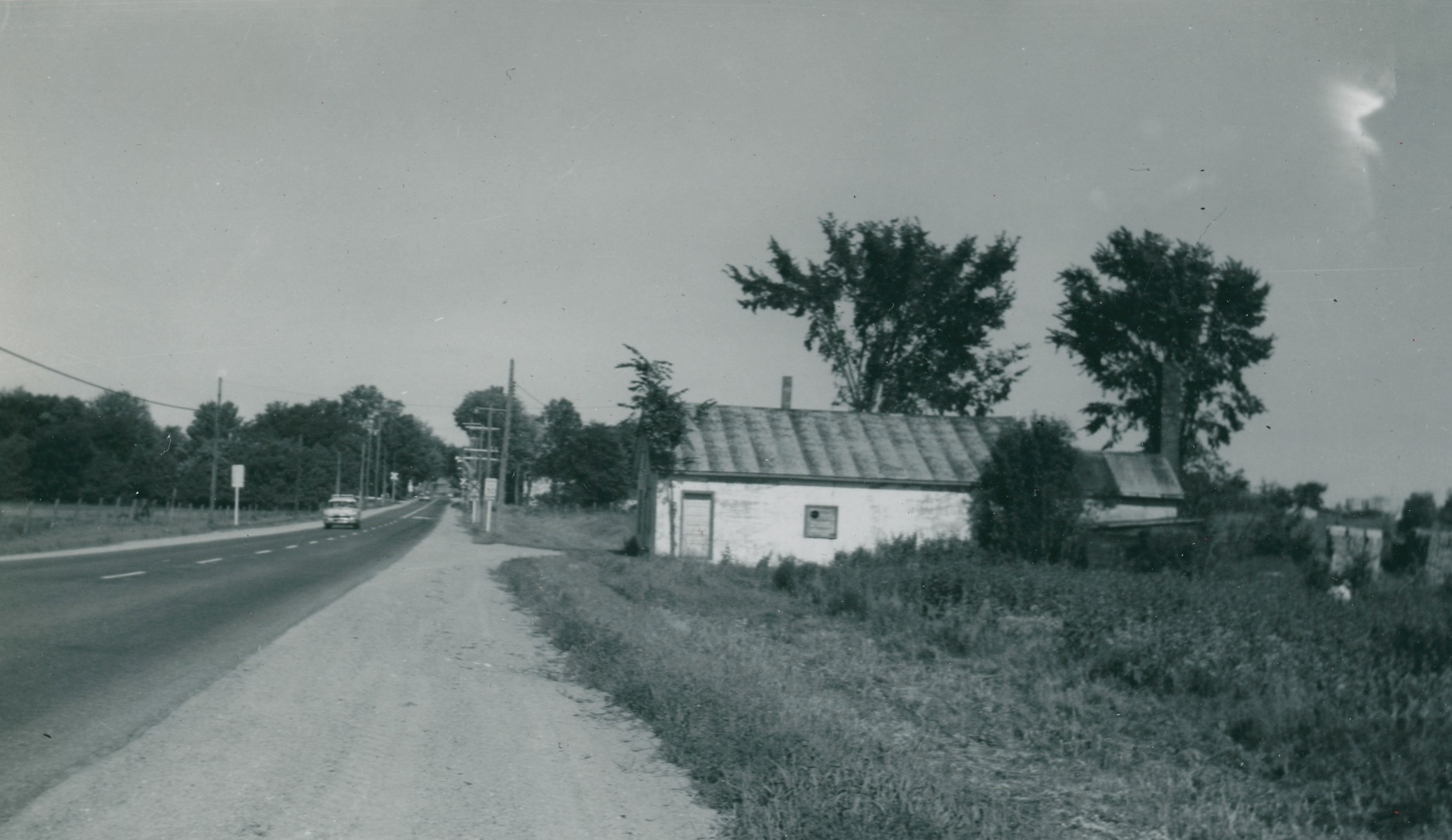 Photo of the Cookstown Creamery building, taken in 1961. The creamery originally opened in February 1929 and was equipped with a large furnace to both heat the building and supply the steam for pasteurizing the cream. By 1930 the creamery was producing an average of 1000 pounds of butter a year, which later increased to 3000 pounds a week. In 1932, butter sold for 16 cents a pound. The creamery closed in 1951. The image here shows the white creamery building on the right surrounded by tall grass, with a road running along the left. A car is just visible on the street near the horizon line.