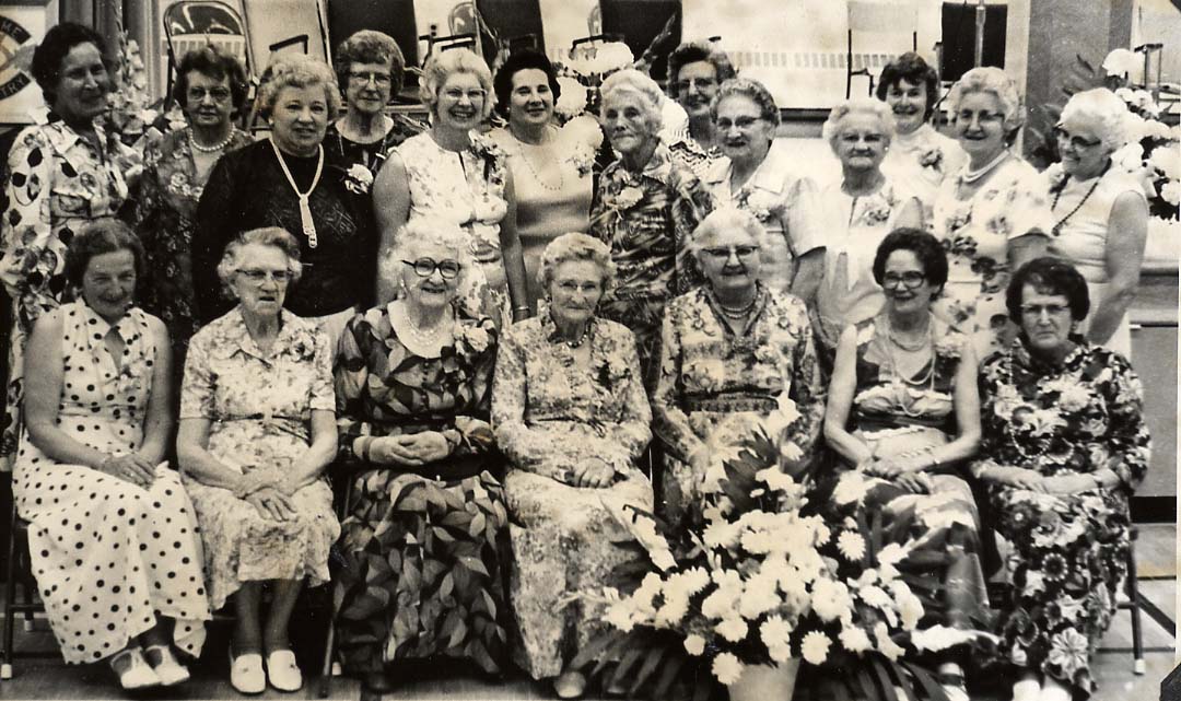 Front Row - left to right - Mrs. H. Parker, Mrs. T. Mayes, Mrs. L. Monkman, Miss Mae Sutherland, Mrs. W. Riley, Mrs. D. Hopper, Mrs. C. Kirby Back Row - left to right - Mrs J.P. Reain, Mrs. H. Smith, Mrs. D. Monkman, President, Mrs. S. Carter, Mrs. Maluski, guest speaker, Mrs. G. Ley, Miss Sarah Slight, Mrs. B. Power, Mrs. H. Donnell, Mrs. D. Evans, Mrs. B. McLean, Mrs. L. Sharp, Mrs. W. Trotter Mrs. N. Baker and Mrs. A. Hansen were present but left the meeting before the picture was taken.