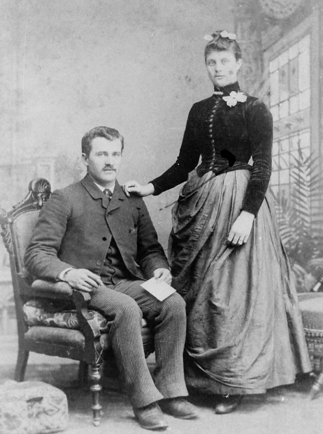 Mr. and Mrs. John R. Cowan - eldest son of Mr. and Mrs. George Cowan. April 11, 1864 - Nov. 13, 1929. Married Alice Moore Feb. 27, 1890 Cowan, John R. Cowan, Mrs. John R. Cowan Alice Moore, Alice Costumes and Clothing Furniture