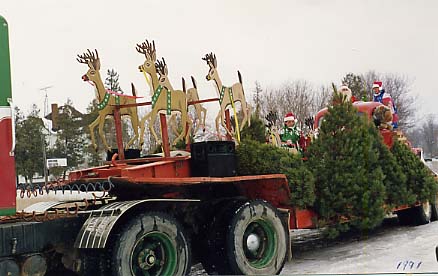 Image taken at 1991 Santa Claus Parade.The image shows a float that is being pulled by a transport truck. The float is decorated as Santa Claus' sleight, and appears to be pulled by reindeers.