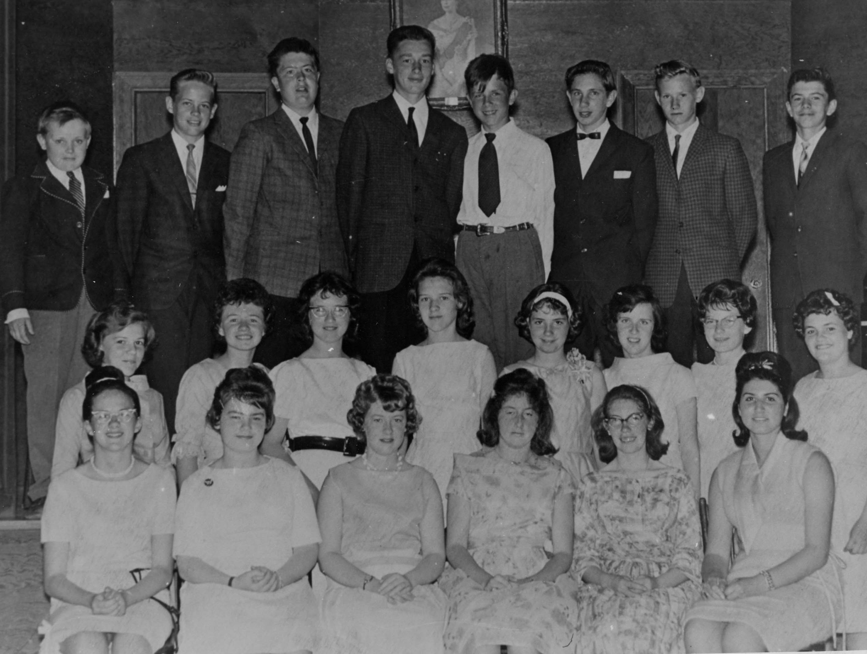 First Graduating Class from Innisfil Central School on the 5th Line of Innisfil. Back Row: (l to r) David Jonah, Kent Sturgeon, Bill Akers, Gary Keown, George Vasalouskiss, William Rainey, Wayne McKinnon, Douglas Kell, missing Walter Kellough. Middle row: (l to r) Sandra Jones, Diane Cooper, Dale Squibb, Shirley Marling, Bonnie Rainey, Marie Hillock, Beverly Beatty, Colleen Barrett. Front row: (l to r) Julianna Kempers, Diane McQuarrie, Janet McQuarrie, Karen Hooper, Mary Ann Burns, Jo-Anne Spataro.