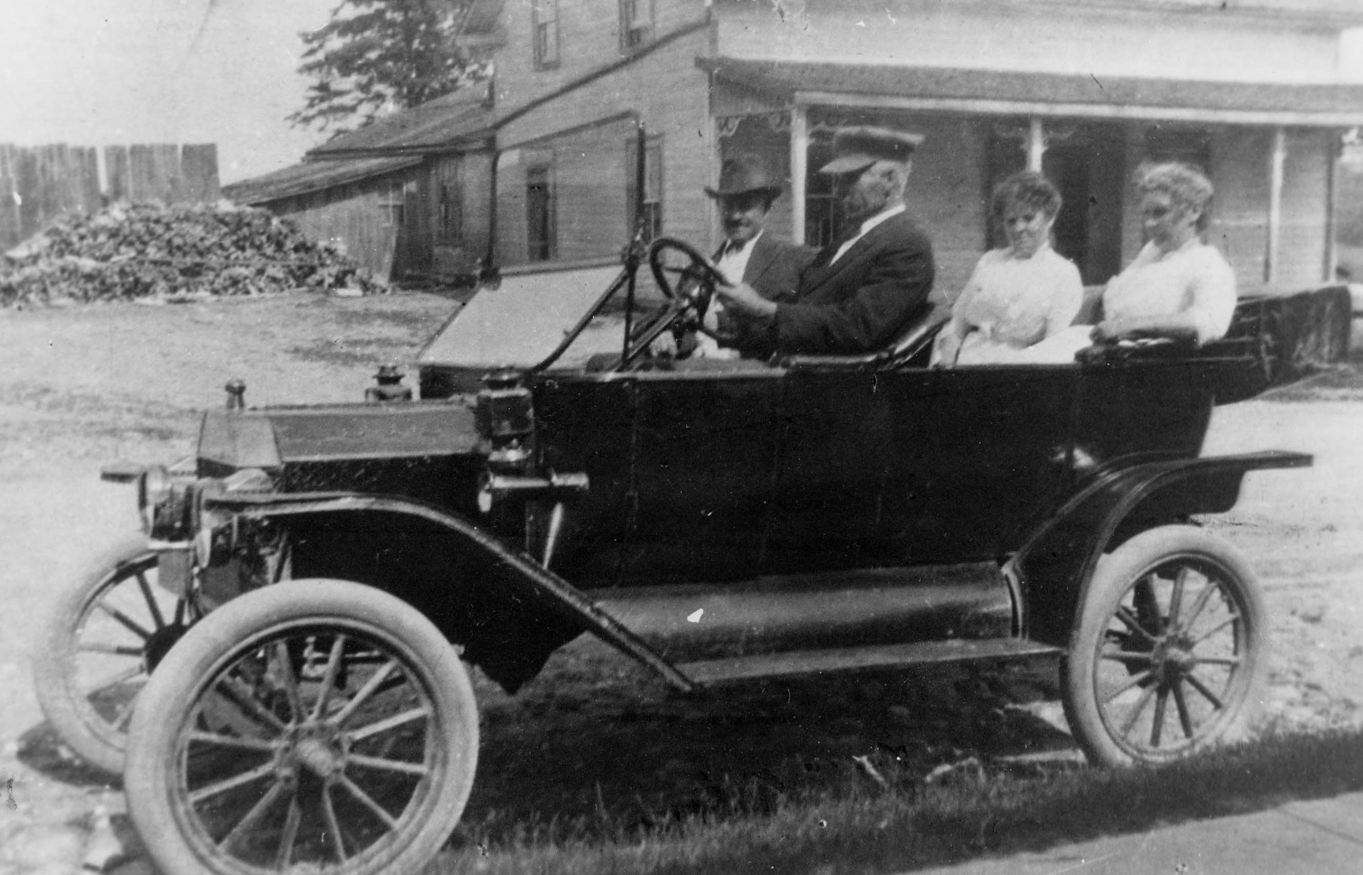 Model T Ford owned by Frank Rogerson. Note the brass radiator, lamps and outside horn. Frank Rogerson driving with Norman Wilson. Left to right back: Lizzie Moir and Christena Rogerson