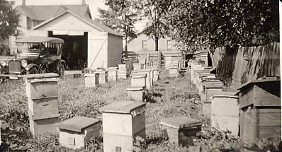 Henry Couse purchased the store located on 14 Queen Street in 1900 for $895. The previous owner, a Mr. Stewart, was a prominent shopkeeper, grain buyer, and coal dealer. Mr. Stewart also ran an apiary business in the back of the lot, which Henry continued to operate until his own retirement. The store itself carried grains, seeds, flour, animal feed, groceries, fruit, and other provisions like coal and oil lamps. It also featured a small ice cream parlour. The Couse family lived in the apartment above the store. The alley beside the store ran past the apiary and led to the skating and curling rink located on Wellington Street. This photo shows a number of bee houses in roughly three rows. A picket fence sides the houses on the right, and a driveway to the left leads to a parked 1930s style car and small garage.