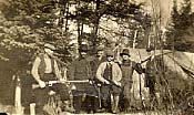 Photograph taken outdoors of six men standing in front of a tent at their camp site prior to hunting. The man holding the gun on the left is Jack Dobson. Next to him, from left to right, are Jim Wreggett, John Flynn, Jack Broley, Art Kidd, and Henry Couse. The photo was likely taken in the early 1900s.