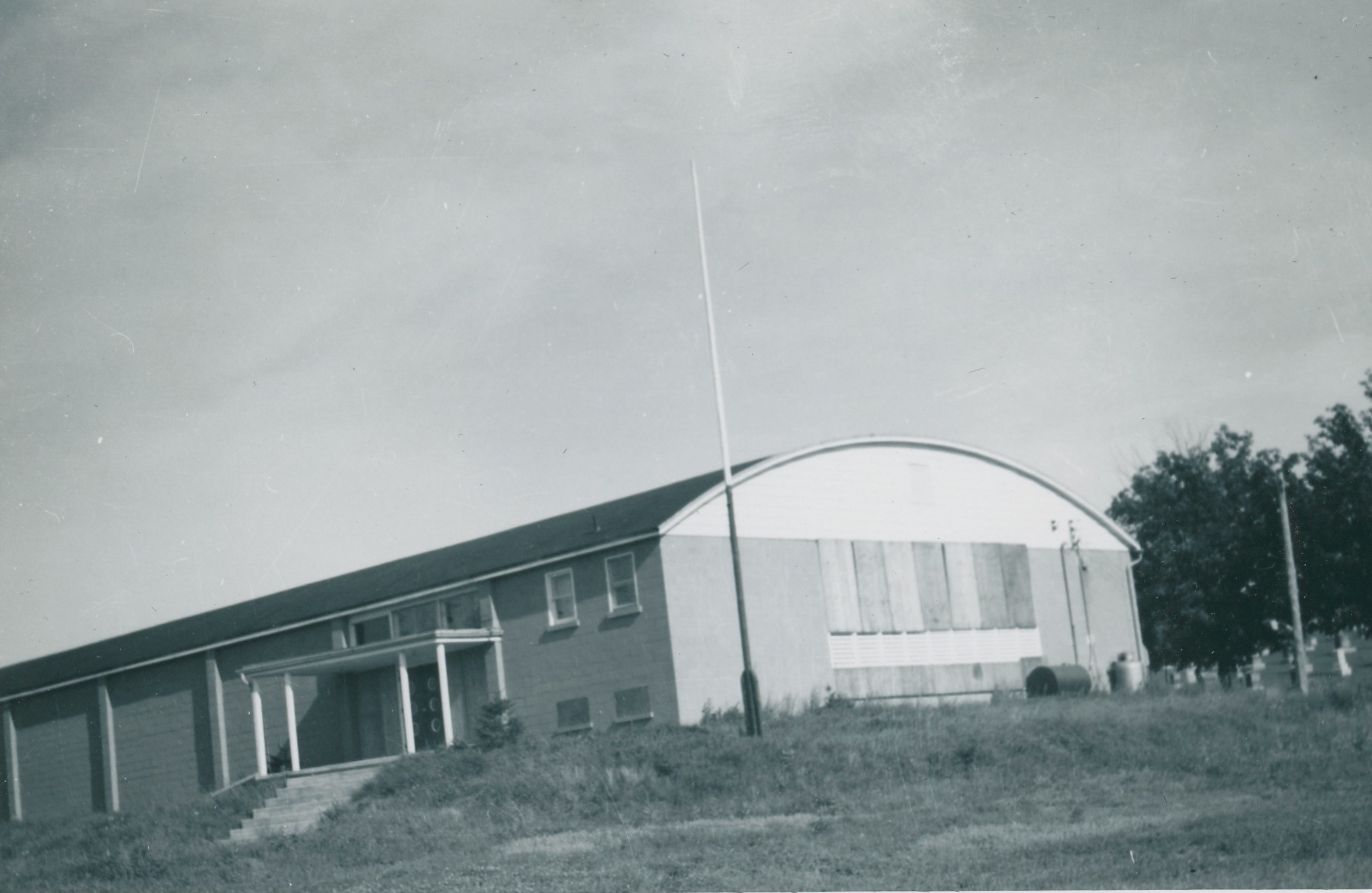 Photo of the exterior of the Cookstown Curling Club, which was a cement block construction built in 1956 by local contractor Hector Smith. Volunteers, both curlers and non-curlers, helped to install the roof, septic system, tile bed, and so on. It is located on the Cookstown Fairgrounds, and features four sheets of ice, a club room, and a kitchen on the main floor with a members-only club room and lockers in the basement.