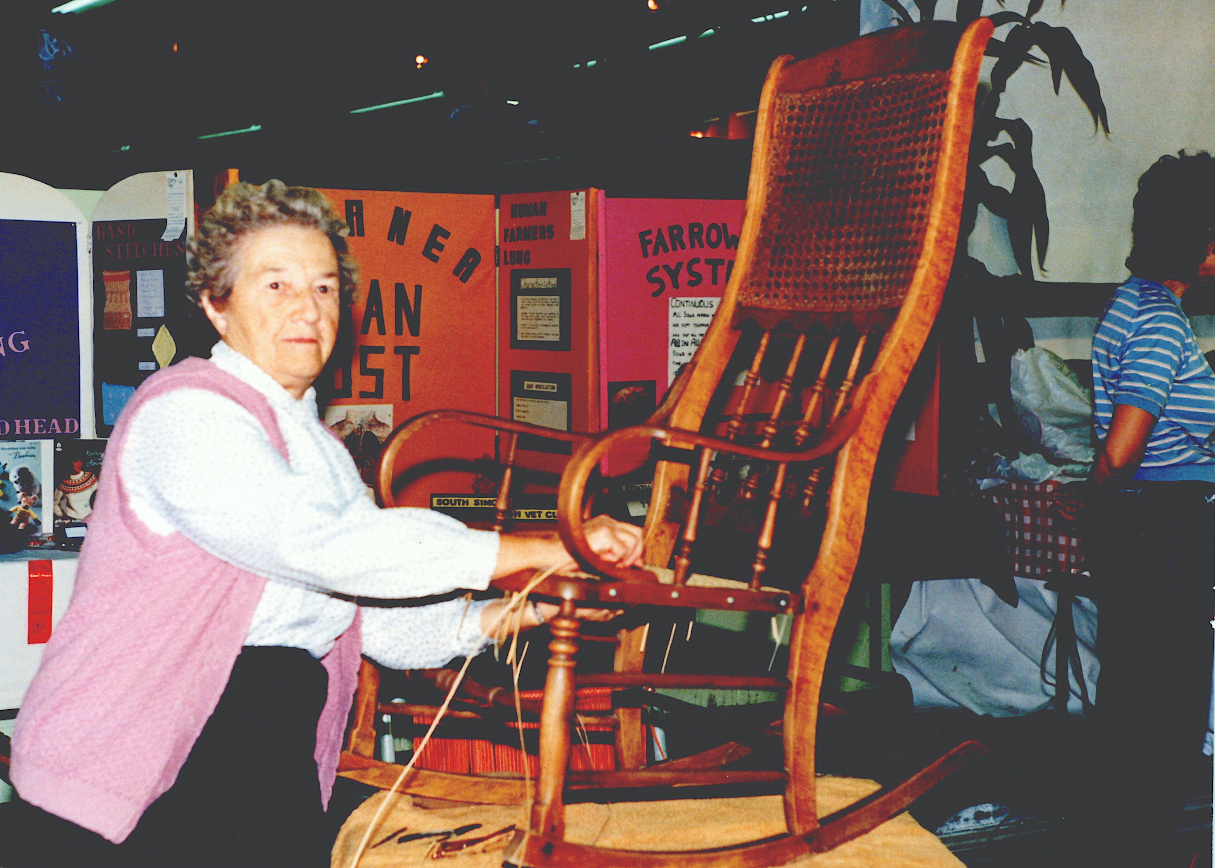 Photograph of Olive Parker, dressed in a white blouse and pink sweater, posed next to a carved wooden rocking chair at the Cookstown Fair in 1989.