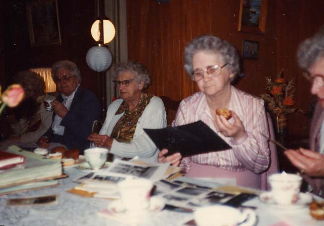 Ladies at Tweedsmuir History Meeting 1983 at the home of Olive Parker. Left to Right - Keatha Riley, Mrs. Bell, Alice Baker, and Mrs. Sylvester (Eva) Carter.