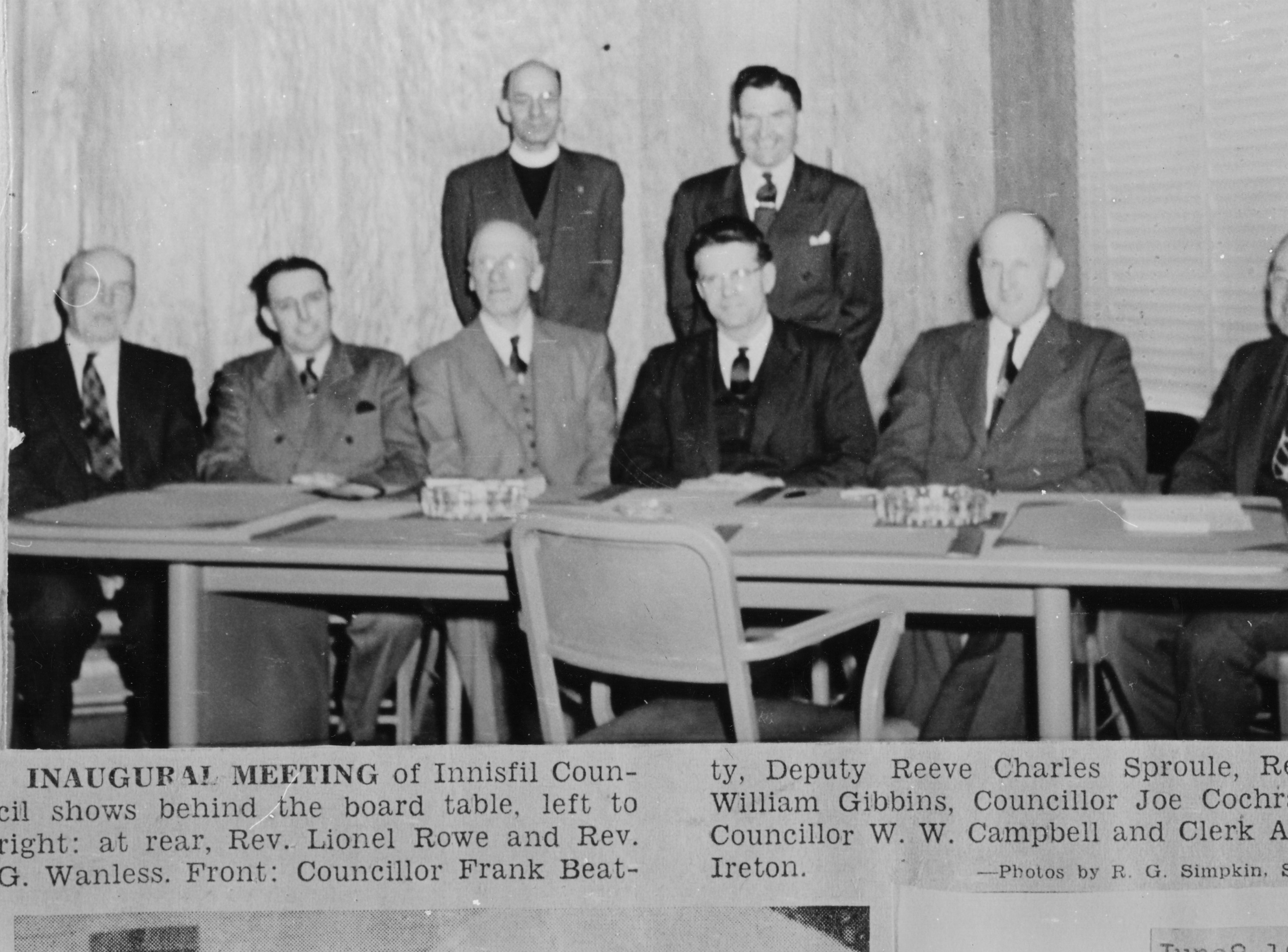 Inaugural meeting of Innisfil Council- L to R at rear-Rev. Lionel Rowe and Rev. G. Wanless Front- Councillor Frank Beatty, Deputy Reeve Charles Sproule, Reeve William Gibbins, Councillor Joe Cochrane, Councillor- W.W. Campbell, Clerk Allen Ireton Page 68 Stroud Tweedsmuir History Vol. II Further information is available at the Knock Heritage Site