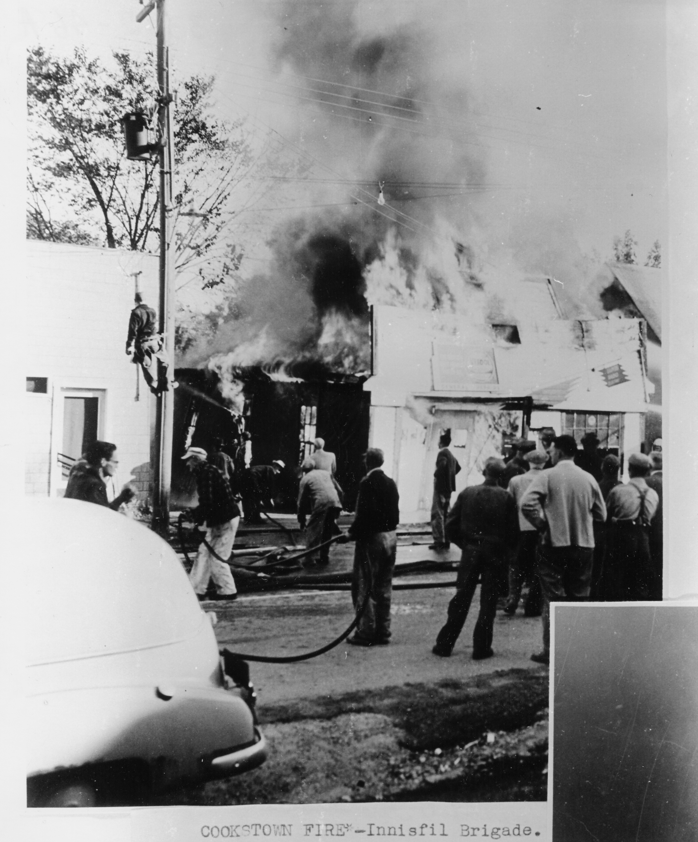 Fires: Photo A: Innisfil fire brigade at a fire in Cookstown Photo B: Innisfil fire brigade at Lefroy elevator fire Photo C: An Innisfil cottage on fire. From page 46q of the Stroud Tweedsmuir History, Vol. 11. Photos B and C on file at Knock document centre.