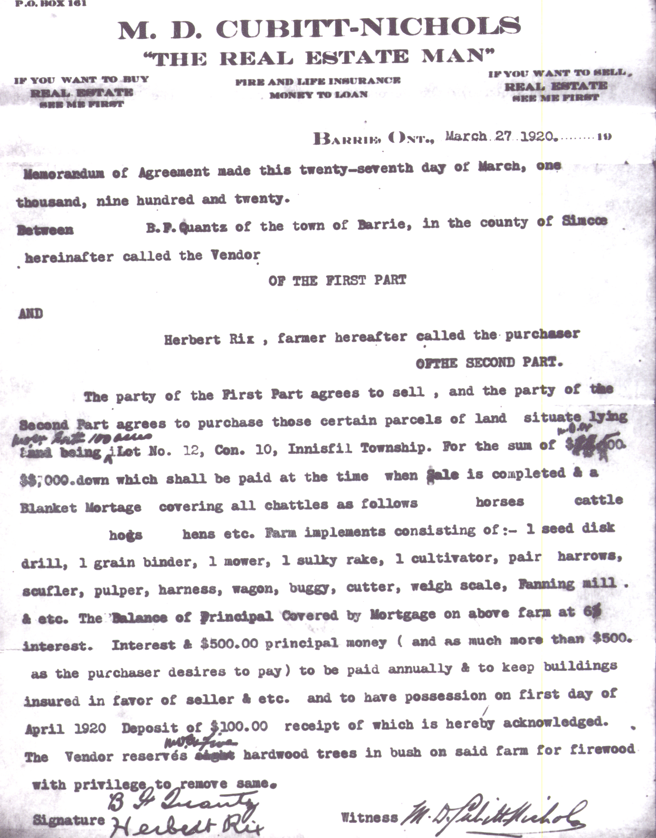 Agreement between B.F. Quantz and Herbert Rix to sell 100 acres of Lot 12, Conc. 10 for $11,500 including horses, cattle, hogs, hens, 1 seed disc drill, 1 grain binder, 1 sulky rake, 1 cultivator, 1 mower, pair harrows, scuffler, pulper, harness, wagon, buggy, cutter, weigh scale, fanning mill, etc. B.F. Quantz Herbert Rix Real Estate - agreement to sell