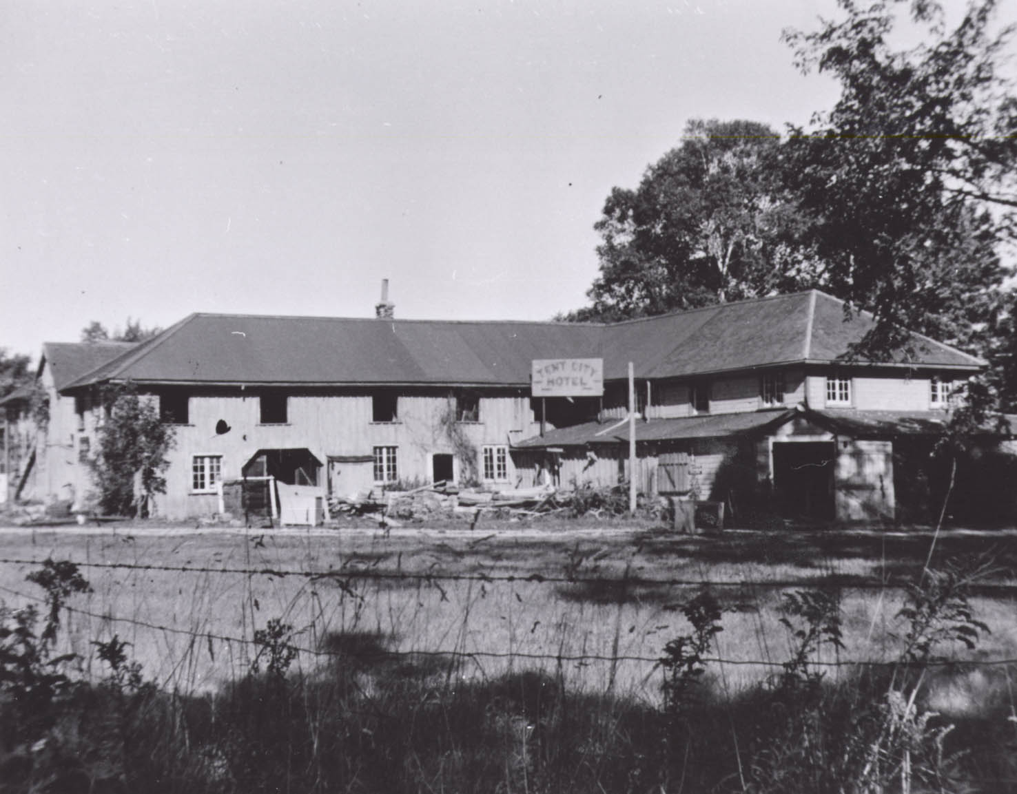 Photo of the Tent City Hotel building on Concession 6 in Innisfil, close to Lake Simcoe. The photo shows the exterior of the two-storey L-shaped building after it had fallen into disrepair. Some of the window panes are missing and there is a rubbish pile in front of an entrance. Tent City was started by Lorne Jack in 1914 and quickly became popular on weekends with residents from Toronto, Barrie, and Bradford. Dances were held on Wednesdays and Saturdays and cost 5 cents per dance. The hotel was closed in the 1950s and demolished in 1953.