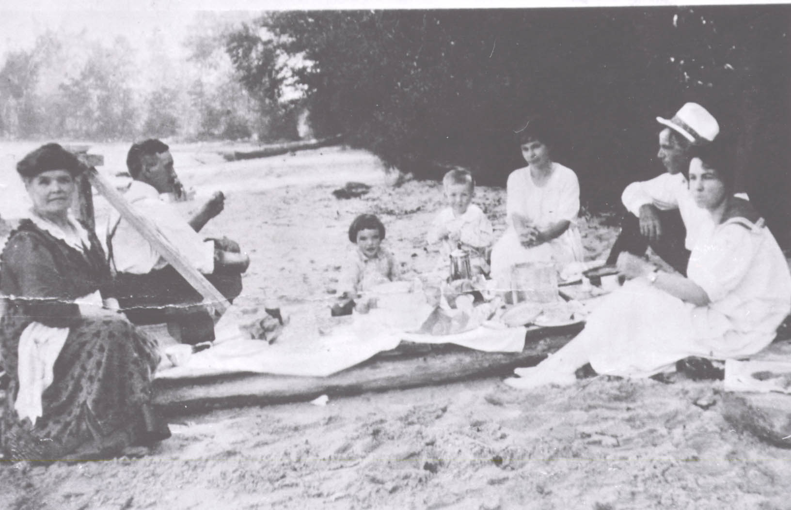 Photo of a picnic at Simcoe Beach near the 7th Line Creek. Pictured from left to right: Susan Westwood, Robert Moore, Kathleen Houston, Bill Houston, Amy Houston, John Houston, and Dorothy Marshall. The photo shows the family and friends sitting in the sand, with the ladies wearing long dresses and the men in white long sleeved shirts gathered around a picnic blanket.