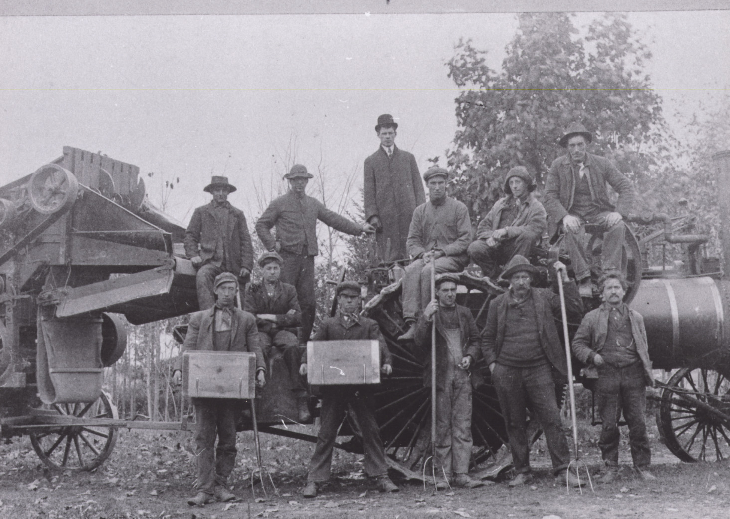 Photo of a team of men assembled beside a self-propelled steam engine and its attached threshing machine with self-feeder. Pictured in the top right is Robert Thompson with Harry Thompson beside him. On the bottom left is likely Calvin Boyd holding a grain box. The rest of the men are unknown. Threshing, which separates the inedible chaff from the edible part of grain, occurred after harvest and before winnowing. Threshing bees were held because the work was intensive and equipment was often shared within the community.