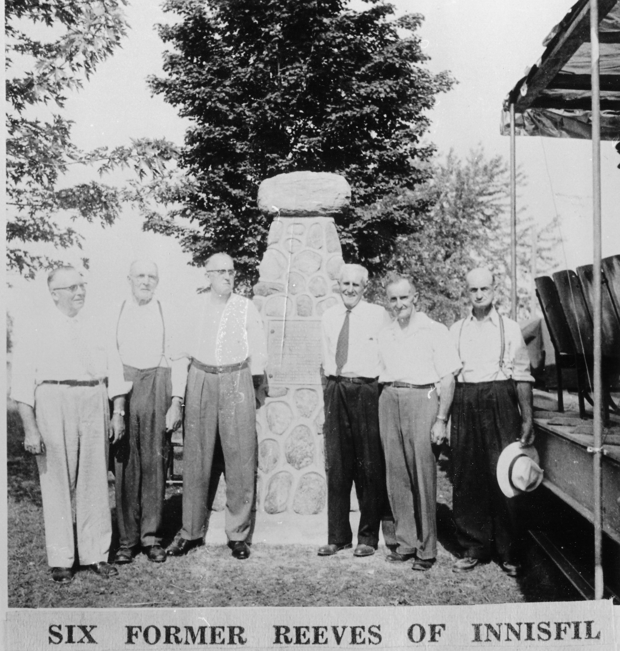 Six former Reeves of Innisfil at the cairn in Innisfil Beach Park. Left to right: Charles W. Henry, Frank Beatty, Alfred L. Webb, Clifford Lockhart, Dalton Banting, Thomas Cook. From Page 74 of the Stroud Tweedsmuir History, Volume 11.