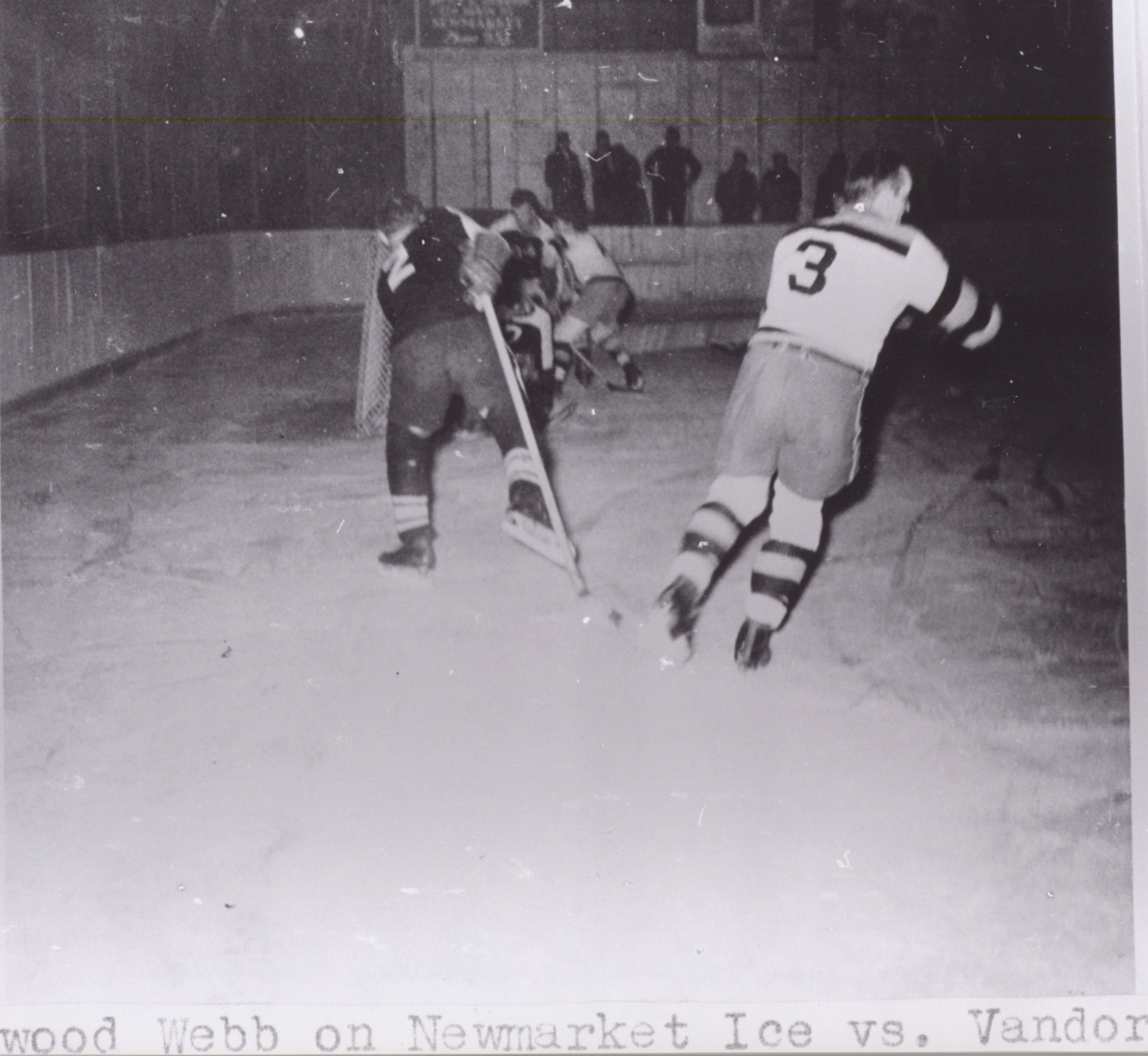 Candid photograph of a group of hockey players on a hockey rink in Newmarket. The two most visible players are wearing a dark jersey with the number 2 and a light jersey with the number 3 respectively. One of the players is Elwood Webb. This information was gathered from page 81 of the Stroud Tweedsmuir History Vol. II. Born in 1923, Mr. Elwood Webb passed away on May 22, 2014.