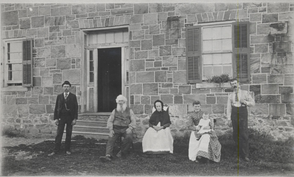 House on South side of 8th line - built about 1862, replacing a log house From left to right: Unknown, Isaac Spring (who came from Markham) his wife Nancy Spring, Eva Latimer and baby, Isaac Spring - father of Wallace Spring In 1970 the stone house with 85 acres sold for $200,000. Costumes and clothing Buildings-Residence of Isaac Spring Spring, Isaac, Spring, Nancy Latimer, Eva Spring, Wallace
