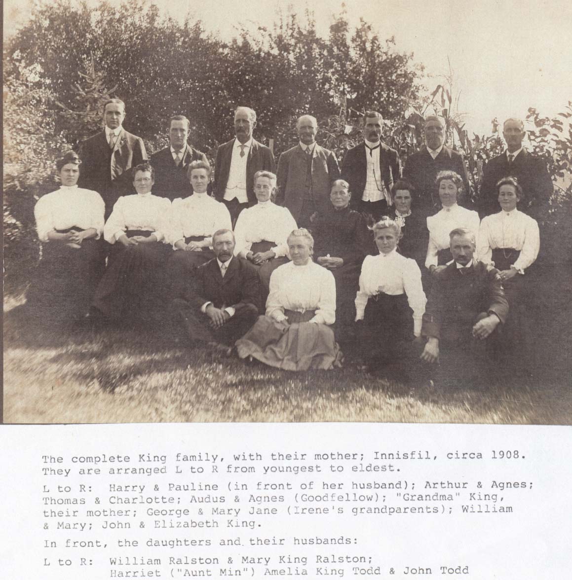 The King Family, left to right, arranged from the youngest to the eldest, wives in front of their husbands: Harry and Pauline, Arthur and Agnes, Thomas and Charlotte, Audus and Agnes (Goodfellow), Grandma King their Mother, George and Mary Jane, William and Mary and John and Elizabeth In front: Daughters and their husbands: William Ralston and Mary King Ralston, Harriet (Aunt Min), Amelia King Todd and John Todd.