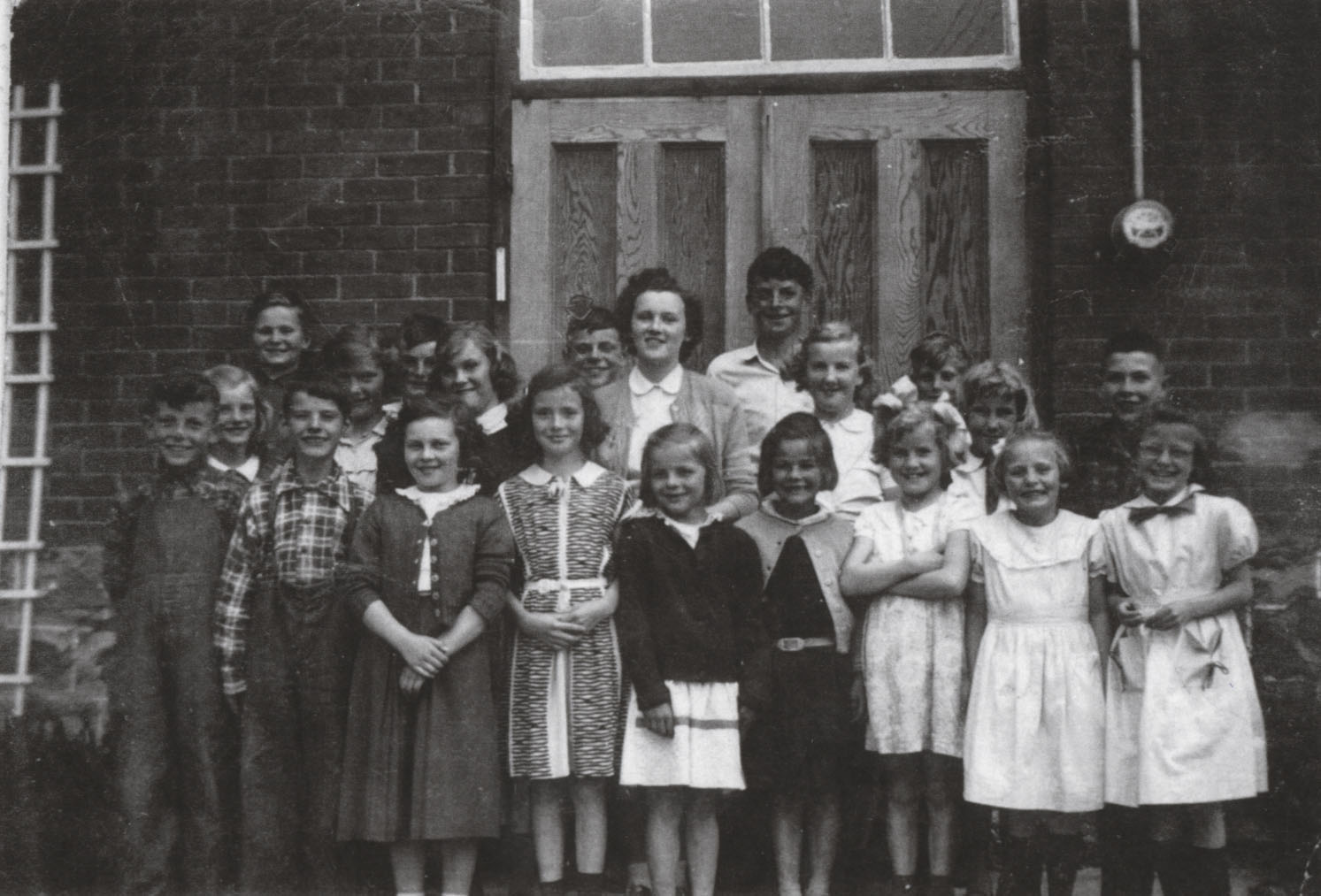 Joyce Morris, teacher, took this photograph of her students: Back row: Ray Sutton, Joe Lagace, Reg Patterson, Art Lagace, Wallace Black Middle row: Trudy Sjerps, Beverly Holt, Barbara Holt, Margaret Campbell, Regina Kleinveld, Christina Kleinveld, ___, Front row: Charles Patterson, Ted Corbett, Norma Campbell, Peggy McSherry, ____, June Corbett, Audrey Kleinveld, Muriel Sutton, Marilyn Sutton
