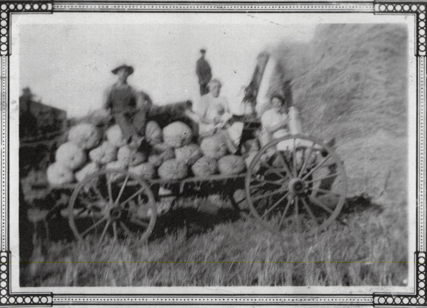 A black and white image taken in 1929 on Dave Cochrane's farm. The image features a wagonload of bags filled with grain. Four people can be seen in the image, additionally a woman holding a baby. From left to right: Joe Roulston, Jack Cochrane, Mrs. Elizabeth Cochrane holding Betty Roulston, Susan Roulston. The farm is located at NH lot 6, concession 11.