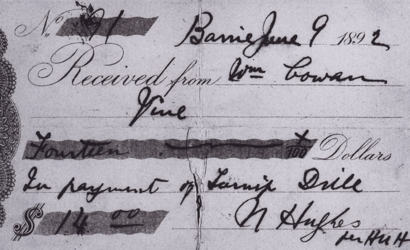 Copy of a receipt given to William Cowan for payment of $14 for a turnip drill from N. Hughes. The receipt is dated to 9 June 1892 in Barrie.