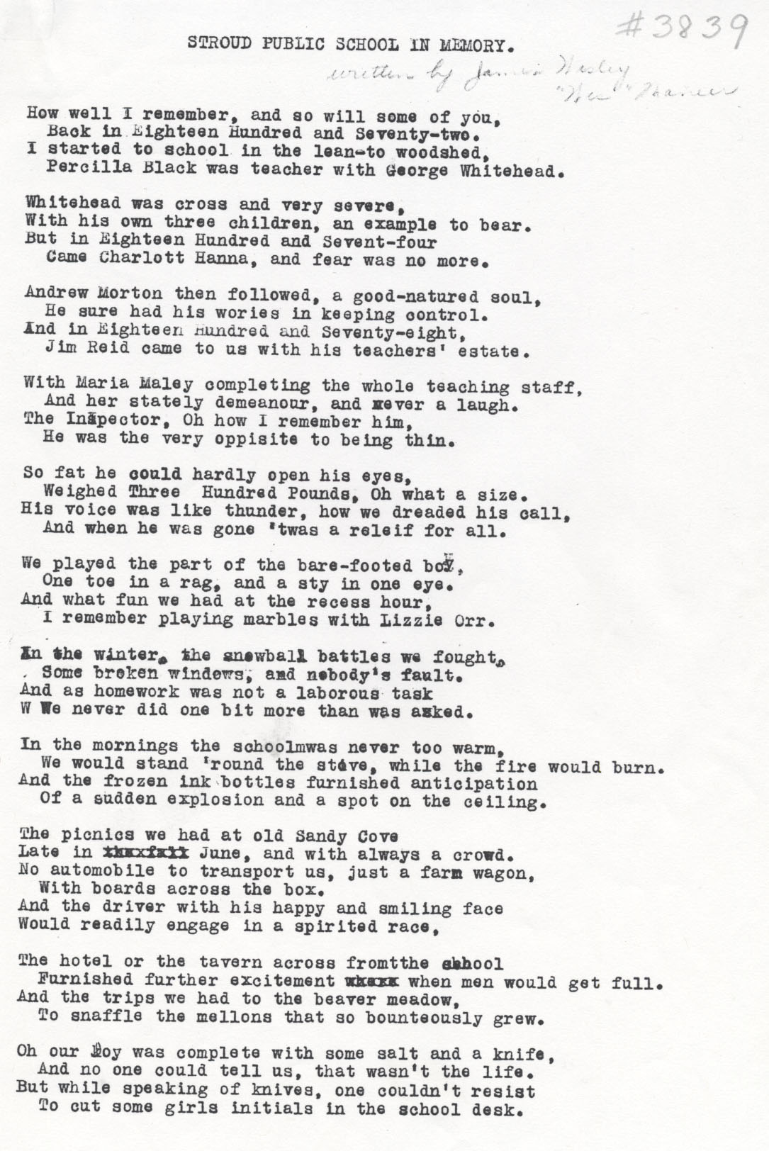 Copy of "Stroud Public School In Memory" a poem written by James Wesley "Wes" Maneer. This is the first page of three. Further information may be acquired at Knock Heritage Site. The text is as follows: How well I remember, and so will some of you, Back in Eighteen Hundred and Seventy-two. I started to school in the lean-to woodshed, Percilla Black was teacher with George Whitehead. Whitehead was cross and very severe, With his own three children, an example to bear. But in Eighteen Hundred and Sevent-four Came Charlott Hanna, and fear was no more. Andrew Morton then followed, a good-natured soul, He sure had his wories in keeping control. And in Eighteen Hundred and Seventy-eighht, Jim Reid came to us with his teachers' estate. With Maria Maley completing the whole teaching staff, And her stately demeanour, and never a laugh. The Inspector, Oh how I remember him, He was the very opposite of being thin. So fat he could hardly open his eyes, Weighed Three Hundred Pounds, Oh what a size. His voice was like thunder, how we dreaded his call, And when he was gone 'twas a relief for all. We played the part of the bare-footed boy, One toe in a rag, and a sty in one eye. And what fun we had at the recess hour, I remember playing marbles with Lizzie Orr. In the winter, the snowball battles we fought, Some broken windows, and nobody's fault. And as homework was not a laborous task We never did one bit more than was asked. In the mornings the school was never too warm, We would stand 'round the stove, while the fire would burn. And the frozen ink bottles furnished anticipation Of a sudden explosion and a spot on the ceiling. The picnics we had at old Sandy Cove Late in June, and with always a crowd. No automobile to transport us, just a farm wagon, with boards across the box. And the driver with his happy and smiling face Would readily engage in a spirited race. The hotel or the tavern across from the school Furnished further excitement when men would get full/ And the trips we had to the beaver meadow, To snaffle the mellons that so bounteously grew. Oh our day was complete with some salt and a knife, And no one could tell us, that wasn't the life. But while speaking of knives, one couldn't resist To cut some girls initials in the school desk.