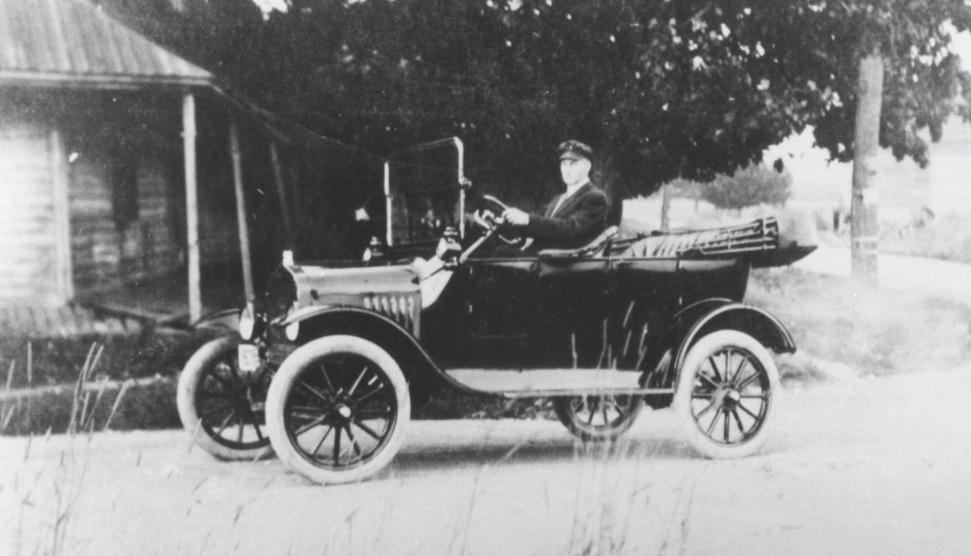William Reid and his first automobile, circa 1915. The Craigvale Presbyterian Church is in the background, right side.