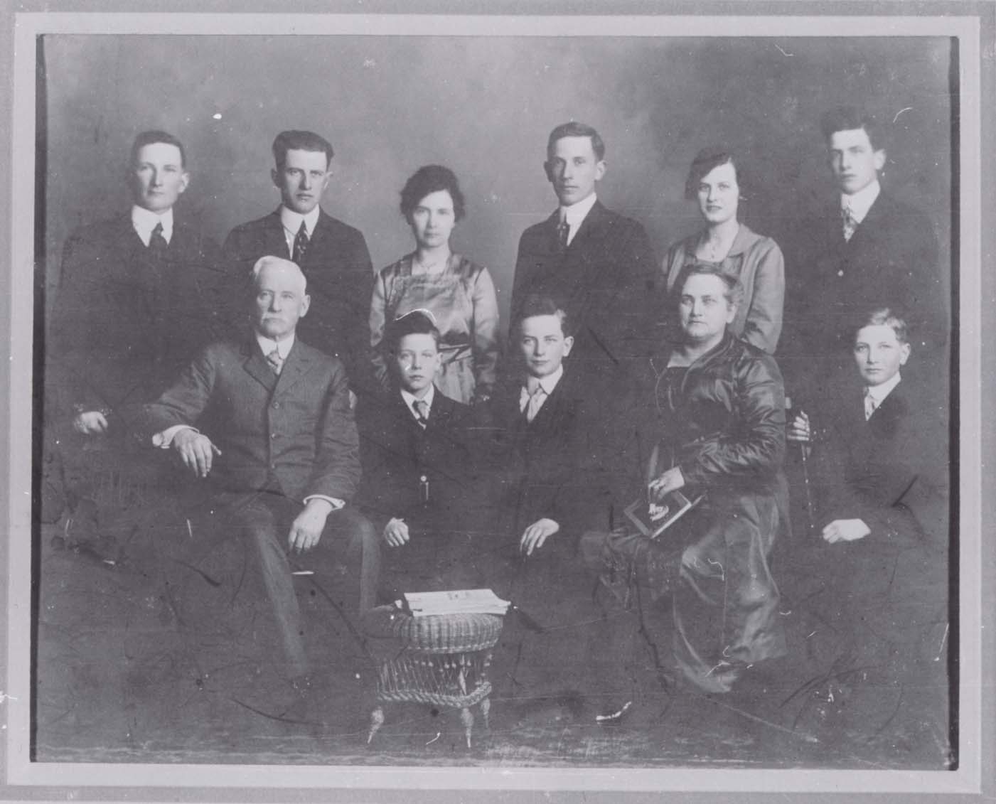 Family of William Kell and his wife Lavinia (Sawyer) Kell Back row from left: John, Robert, Ida (Mrs. H. Hussey, Seymour, Ethel, Frank Front row: William Kell, Clifton, Clarence, Mrs. Kell, Theodore Kell, William