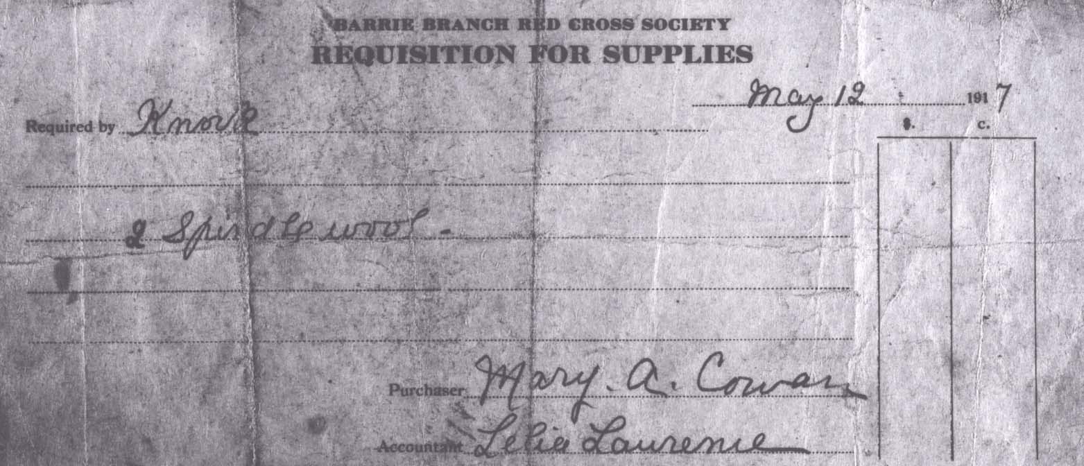 Copy of a supply requisition for the Barrie Branch of the Red Cross Society dated to 12 May 1917. The request was for two spindles of wool with the purchaser listed as Mary A. Cowan and the accountant as Lelia Laurence. The cost is not listed.