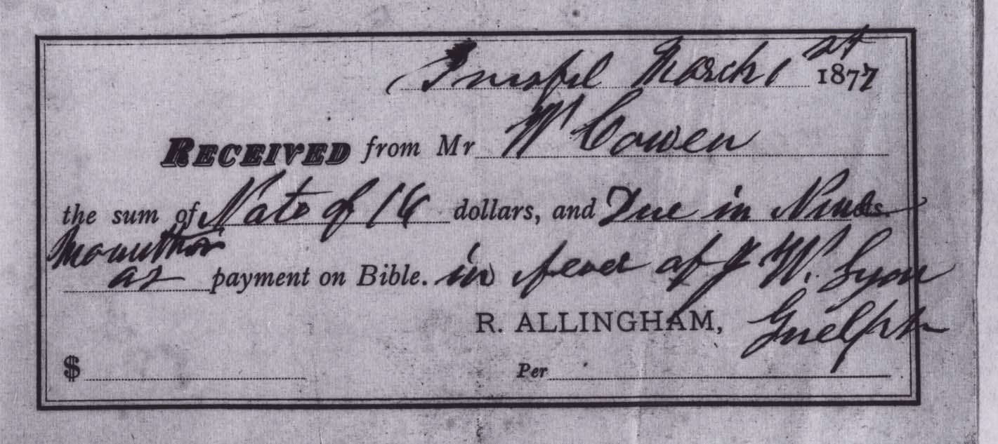 Receipt to Mr. Wm. Cowan from R. Allingham per J.W. Lyan, Guelph, for payment on Bible. Further information is available at the Knock Heritage Site
