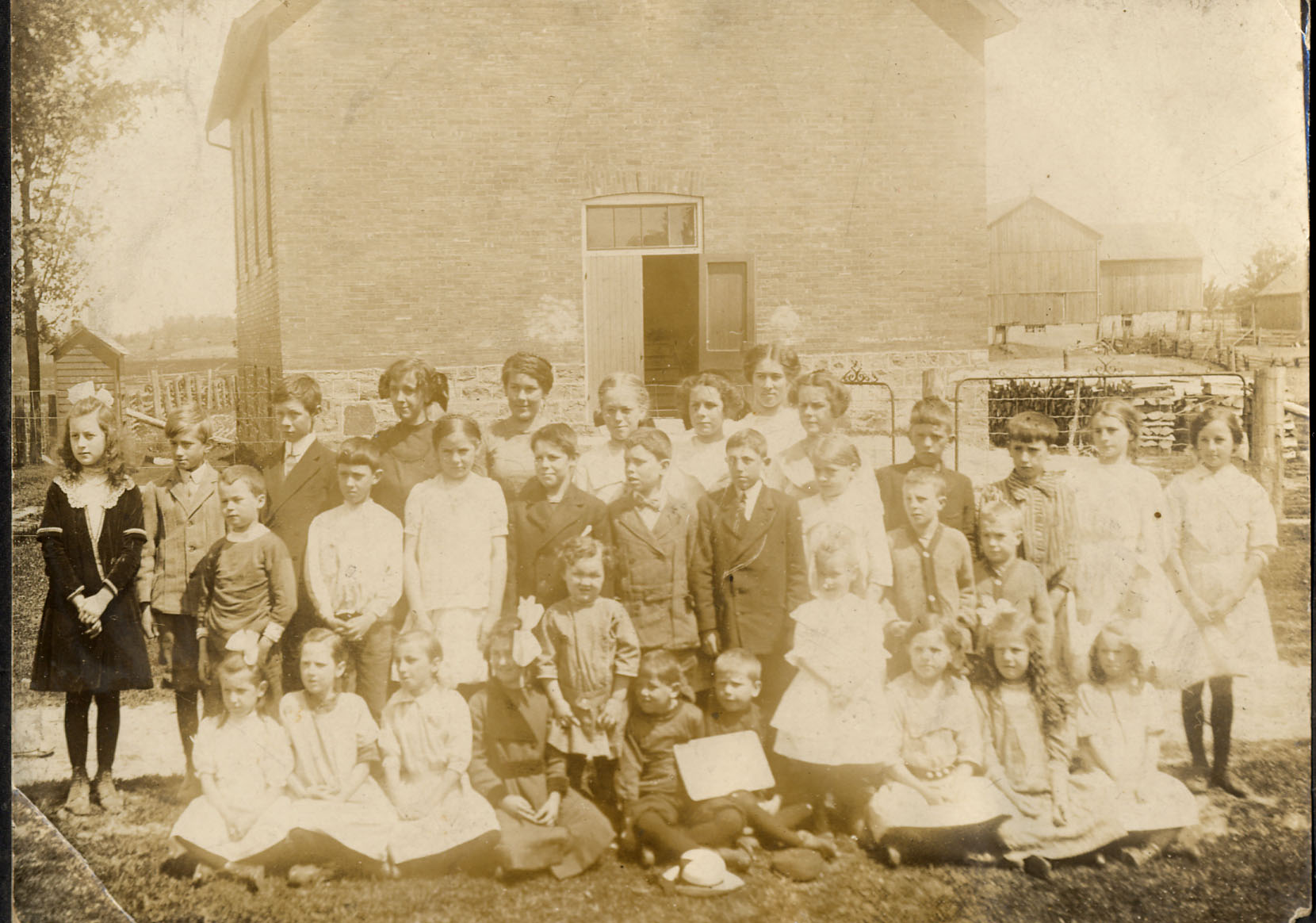 Class photo taken in 1910 for the one room school house known as S.S. # 6, Killyleagh School, on land donated by William Sharpe on his farm to the County of Simcoe. The farm was located on the corner of Centre Street (5th Sideroad) and the Sixth Line in the Township of Innisfil. The Sharp (original spelling) Family acquired title to the farm in 1853. The farm was originally 100 acres. In the 1930s during the Depression an adjoining farm of 50 acres owned by the Rodgers family was sold by the Township for taxes, which William Sharpe purchased the 50 acres on the tax sale and increased his own farm to 150 acres. This evidently resulted in the Sharpe and Rodgers families understandably becoming estranged. Descendants of William Sharpe donated the original photo to the Simcoe County Archives and were provided with a digital copy. One of William Sharpe’s three daughters, Muriel Sharpe (Cornes) (Meeke), is the sixth child from the left in the back row with her blonde hair pulled back wearing spectacles. All three of his children attended the school. This information was provided by Barbara Cornes, daughter of Muriel Sharpe, to her son Alan Heisey in September 2020. The only other identified student is Elizabeth Easton, located in the back row on the right.