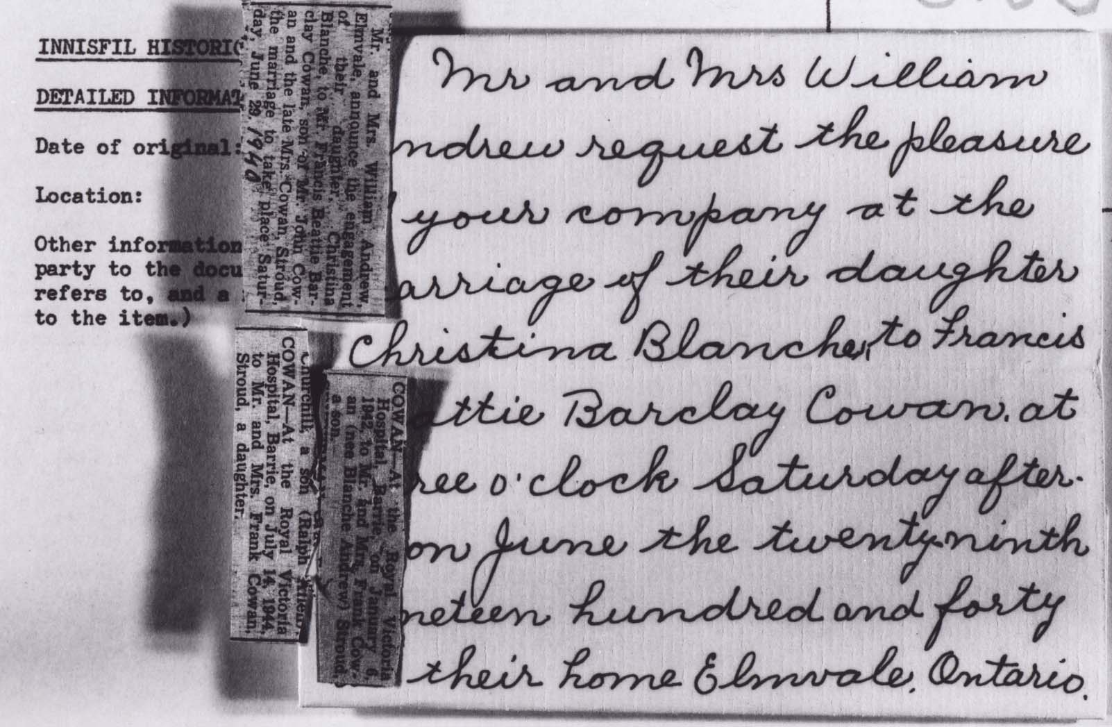 l. A hand written Wedding invitation re Blanche Andrew and Frank Cowan 2. Newspaper announcement of the engagement Blanche Andrew and Frank Cowan Social Events - Wedding Blanche Andrew Frank Cowan