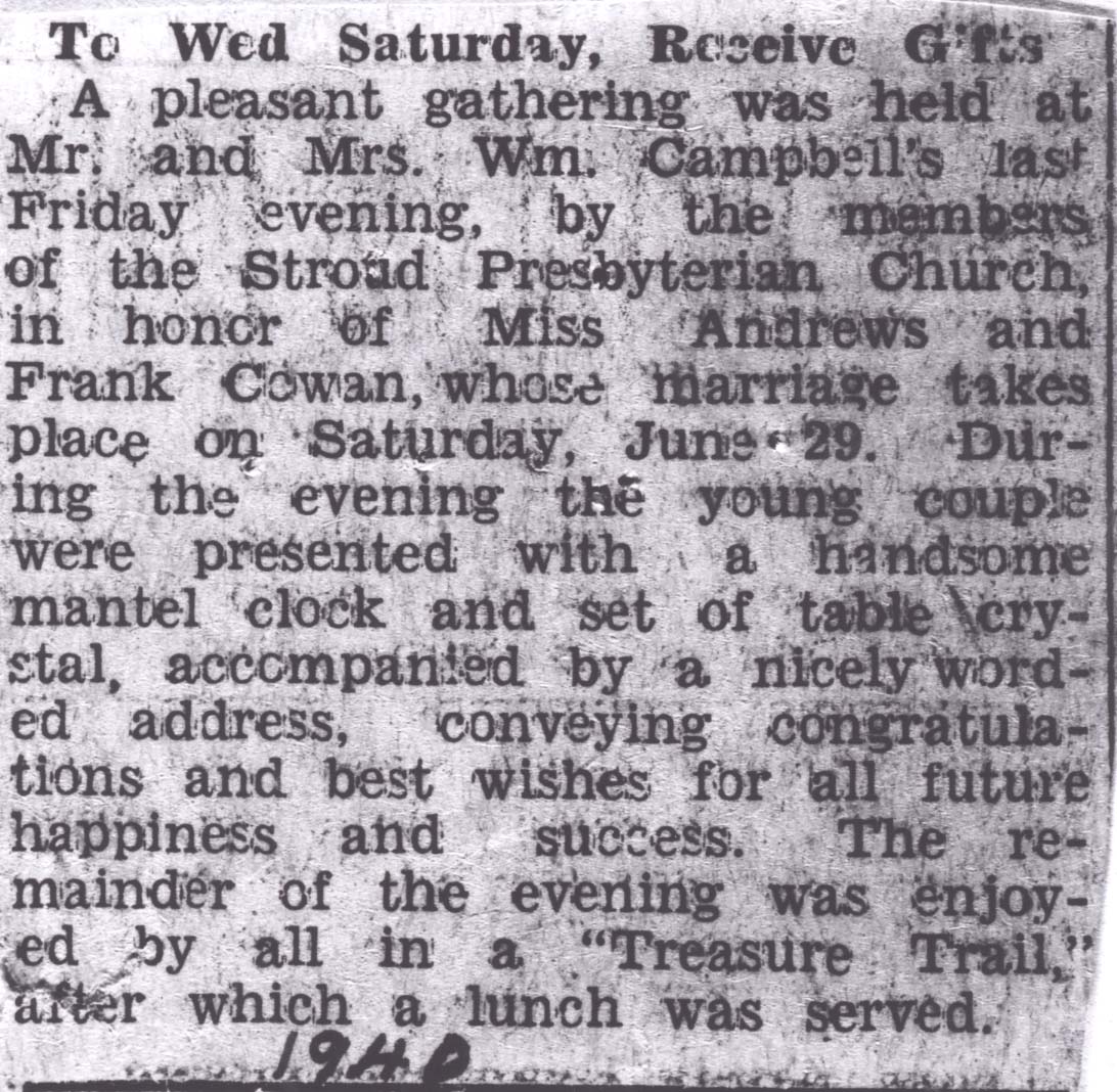 Account of party for Frank Cowan and Blanche Andrew previous to their marriage on June 29, 1940. Party at Stroud Presbyterian Church Frank Cowan Blanche Andrews Social Events - Engagement party