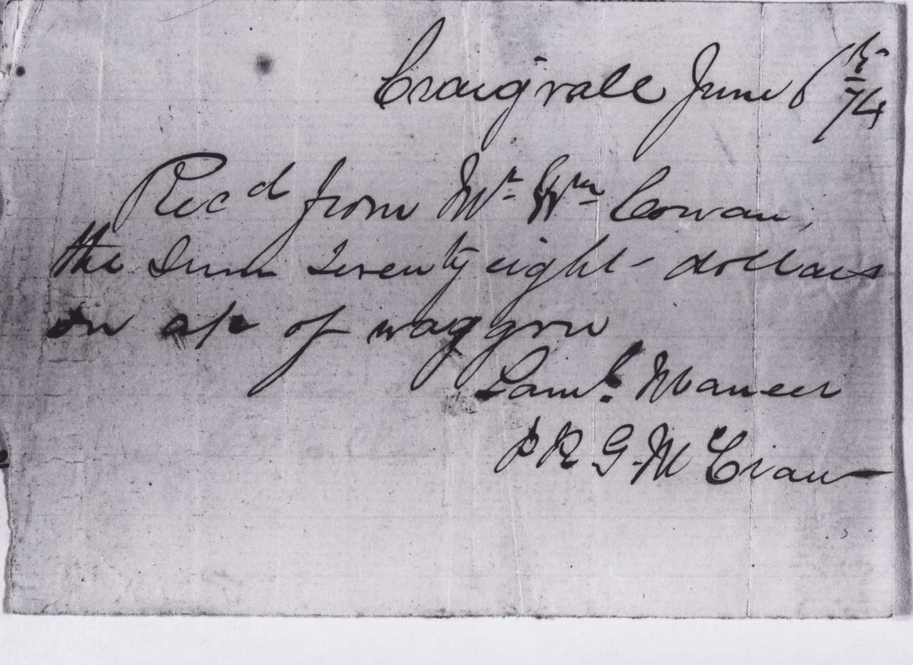 Receipt to Wm. Cowan from Sam'l Mancer per G. McCraw Further information is available at the Knock Heritage Site