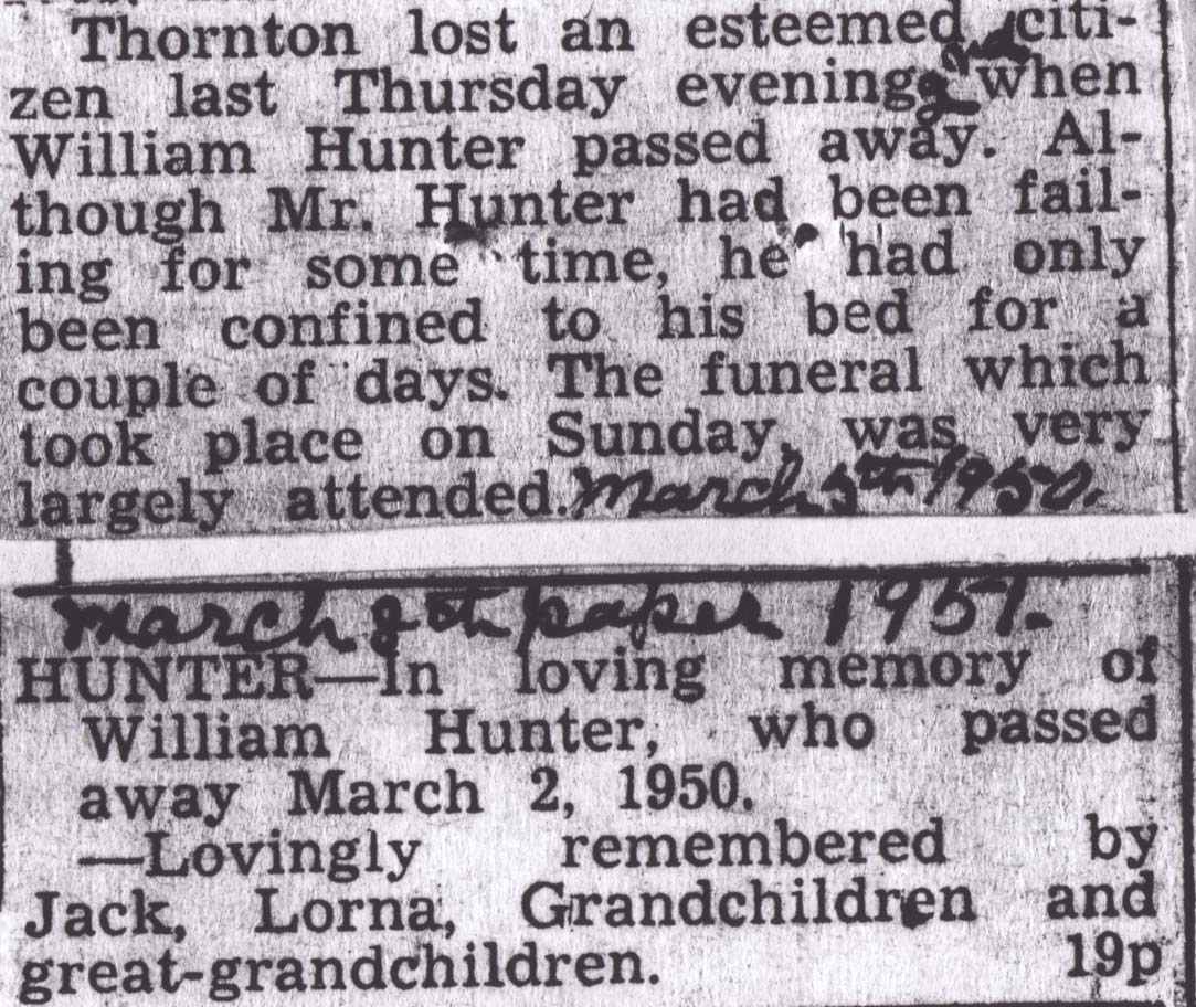 l. Death notice re William Hunter 2. In memoriam notice - March 1951 William Hunter Jack Hunter