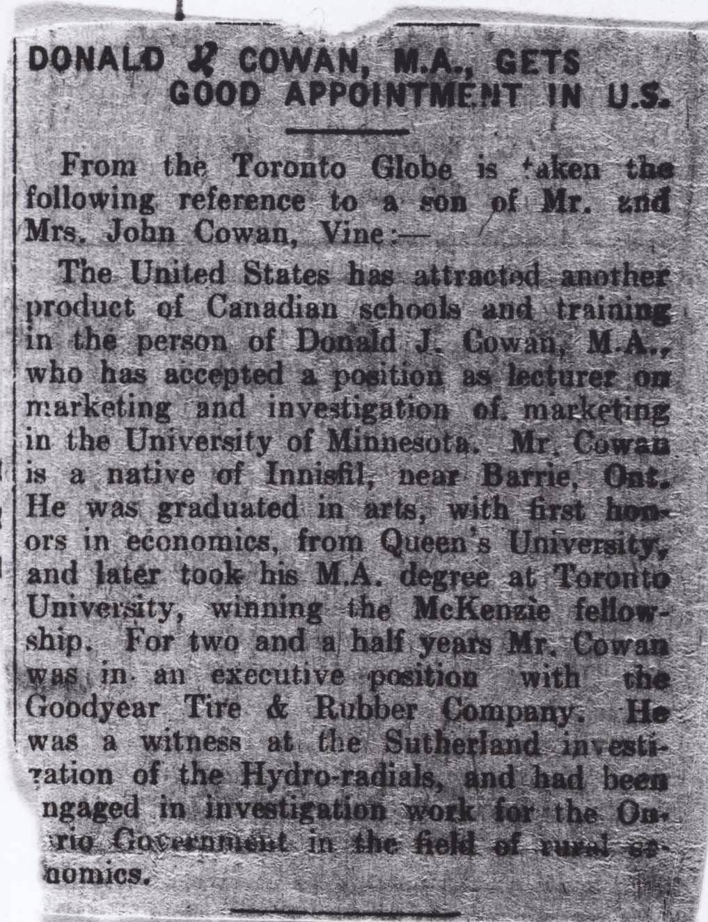 Report (newspaper) of the appointment of Donald Cowan as lecturer at the University of Minnesota.