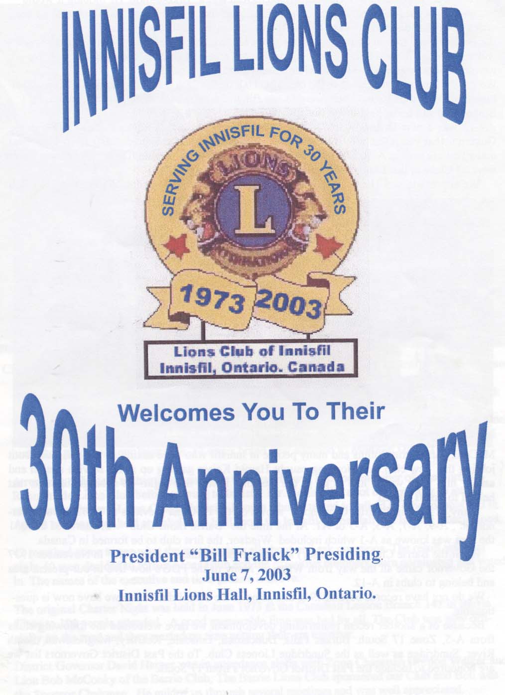 Copy of the Innisfil Lions Club 30th Anniversary Brochure bearing the Lions Club logo and the text "Innisfil Lions Club welcomes you to their 30th Anniversary - President Bill Fralick Presiding, June 7, 2003, Innisfil Lions Hall, Innisfil, Ontario."