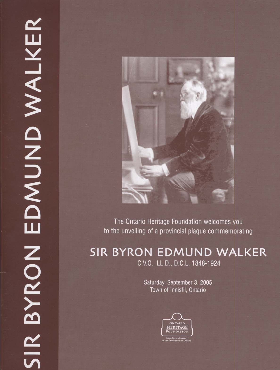 Program and Background information re: the Unveiling of a plaque commemorating Sir Byron Edmund Walker on September 3, 2005. at the Walker Estate NH Broken Lot 25 Further information is available at the Knock Heritage Site