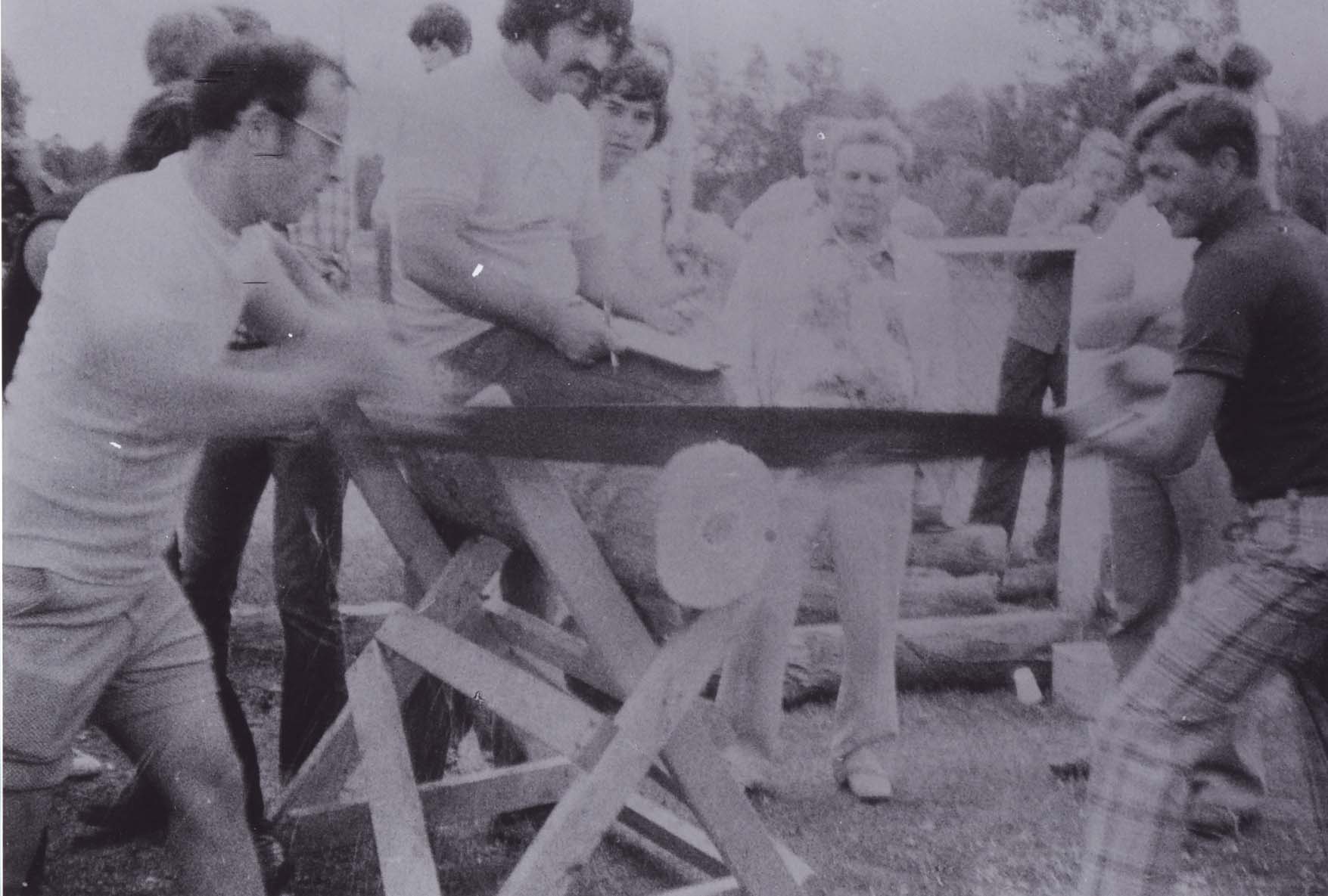 Log sawing contest at Innisfil Township Park, 1976. Left - Mervyn Wice, centre - Dwight Nelson, right - Wayne Ayres. From Stroud Tweedsmuir Histories, Vol. 111. Note: this page is not microfilmed.