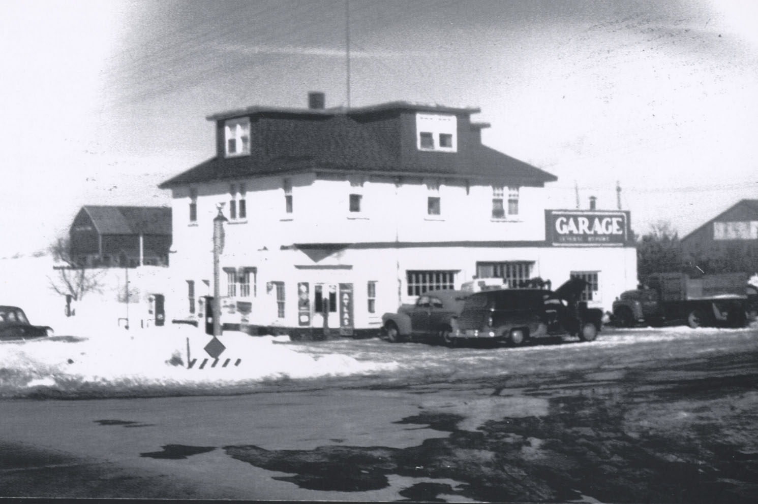 Frank Jones with his wife, Marjorie, was the proprietor of the Alcona Garage, located at the northeast corner of Highway 11 (Yonge Street) and Innisfil Beach Road (Concession 8). Frank Jones bought this property from James Albert Ferris on 19 April 1933. James Ferris' daughter, Hilda, married Archie McNabb, who owned the farm in the background and surrounding the garage from at least 1942 onward. The garage was opened in 1933. Previously, Mr. Jones operated a garage on the southeast corner of Concession 8 and the 20th sideroad on the Jones farm. It was purchased by the D.H.O. to widen the corner in 1970. The building was sold to A. Yeates and is now a residence at south half Lot 20, Concession 7.